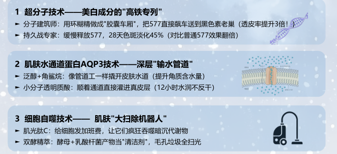 美白明星成分577,比377更温和,直接阻断黑色素信号传输,搭配红色钻石-火棘果、覆盆子酮葡糖苷,像'黑色素吸尘器’一样把沉积的斑块连根拔起!