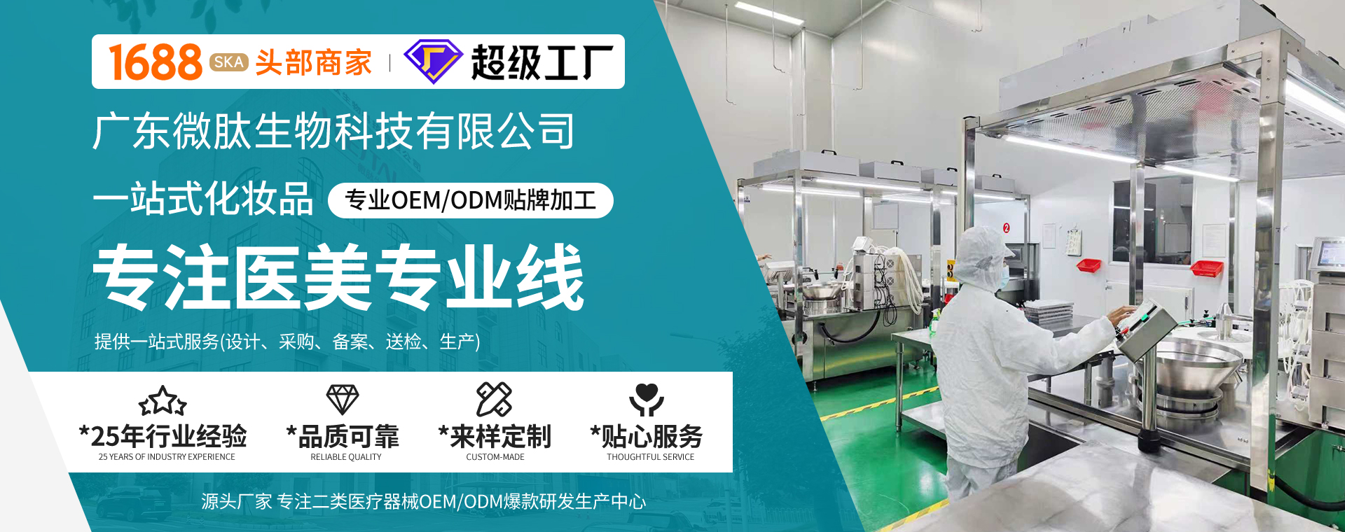 我们公司微肽生物在全国拥有广州白云、佛山南海、湖南长沙、广东肇庆、海南等六大生产基地,其中湖南基地专注于二类、三类医疗器械(械字号)的研发与生产,配备十万级GMP无菌车间(局部百级)、进口冻干设备及全自动灌装线。公司长期与湘雅医学院、暨南大学基因药物研究中心等高校及临床机构开展产学研合作,在重组胶原蛋白、贻贝粘蛋白、丝素蛋白、三文鱼、多肽冻干、植物提取等核心技术方向积累了50多项发明专利。这些硬实力,都转化为您产品背后的技术壁垒。