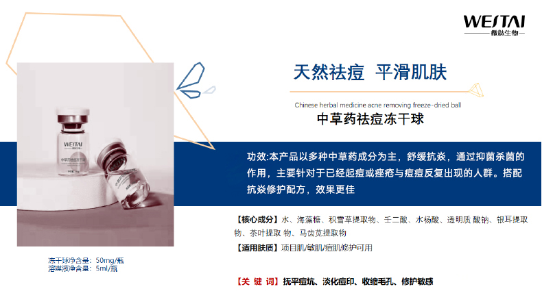 微肽生物中草药祛痘冻干球融合了现代生物科技与传统中草药精华,针对痘痘肌的成因(如油脂分泌过多、细菌感染、炎症反应等)进行多维度修护。其主要功效包括: