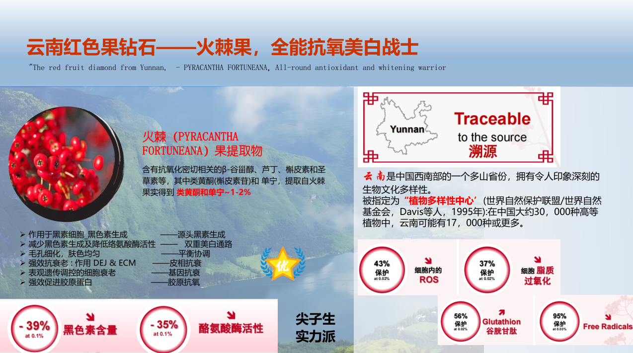 核心成分:577、覆盆子酮葡糖苷、火棘果提取物、凝血酸、羟乙基哌嗪乙烷磺酸、肌光肽C、酵母菌大米发酵滤液、乳酸杆菌产物、突厥蔷薇花水。