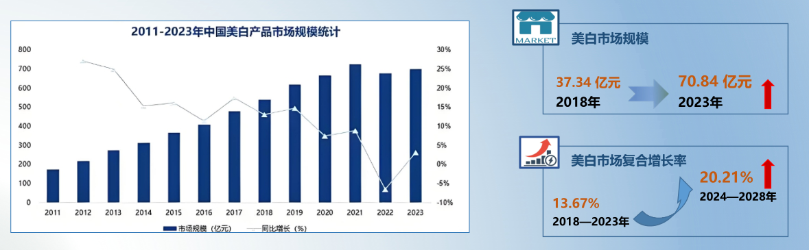 中国消费者对美白的追求由来已久,传统观念中“一白遮三丑”的审美标准一直影响着消费者对美白产品的需求。美白面膜市场规模从2018年的 37.34 亿元人民币增长至 2023 年的 70.84 亿元人民币,年均复合增长率达 13.67%。预计未来几年,2024 年至 2028年的年均复合增长率将达到 20.21%, 市场规模将从 2024年的86.94 亿元人民币增长至2028年的181.52 亿元人民币。