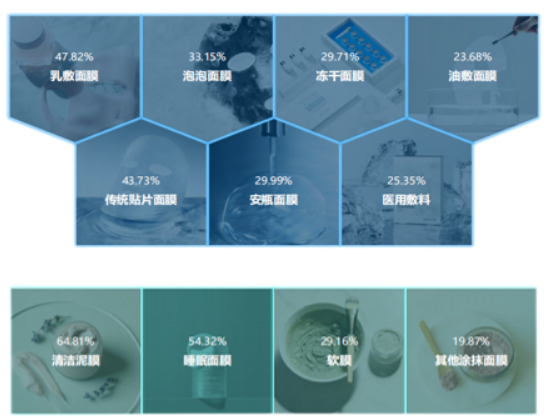 涂抹面膜持有较高占有率,清洁泥膜占有半壁江山。